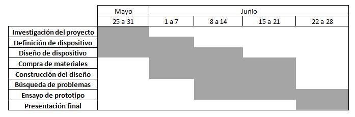Debido a los nuevos plazos exigidos, tuvimos que reconsiderar la estructura de nuestra antigua carta Gantt, la que nos permitirá ordenar nuestros tiempos de construcción. Es de esta forma cómo llegamos a la siguiente planificación