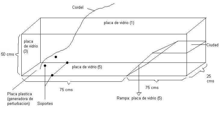 A partir de esa estructura tenemos que construir lo que nos proporcionará la perturbación del agua deseada (ola), la que haremos ubicando una placa plástica en el fondo del acuario, sujeta a este solo por un extremo (para que pueda funcionar cual puerta) en el lado opuesto de la ciudad. Dicha placa será tirada por un cordel y esta deberá detenerse a 45 grados de la horizontal, lo que lograremos ubicando soportes en las paredes del acuario. Así la placa al levantarse generará la perturbación deseada (cabe señalar que el cordel que levanta la placa será tirado manualmente).