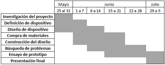 Debido a los nuevos plazos exigidos, tuvimos que reconsiderar la estructura de nuestra antigua carta Gantt, la que nos permitirá ordenar nuestros tiempos de construcción. Es de esta forma cómo llegamos a la siguiente planificación